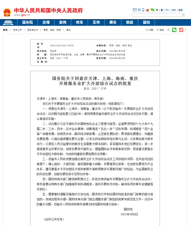 一、同意在天津市、上海市、海南省、重庆市(以下称四省市)开展服务业扩大开放综合试点,试点期为自批复之日起3年。原则同意四省市服务业扩大开放综合试点总体方案,请认真组织实施。